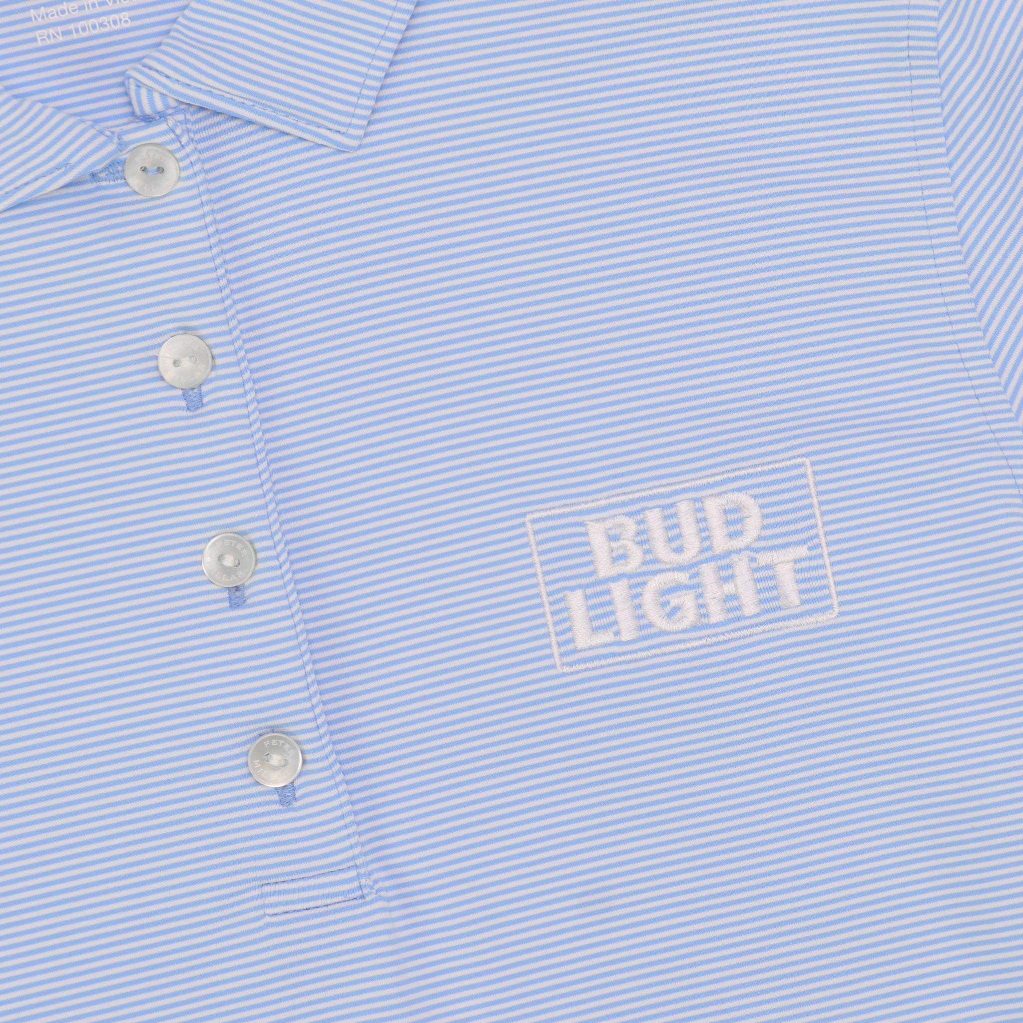 Stand out in style with the Bud Light Peter Millar Women's Polo! This classic polo features blue and white stripes, high quality polyester/spandex blend fabric, and a white Bud Light stacked logo embroidered on the front left chest. Perfect for those who want to look and feel great.